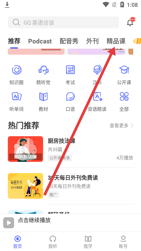 1、打開每日英語(yǔ)聽力APP,點(diǎn)擊首頁(yè)精品課進(jìn)入。