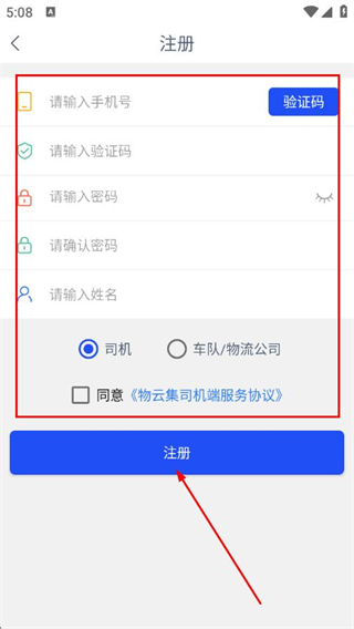 4、輸入手機(jī)號(hào)、驗(yàn)證碼、密碼、姓名,選擇身份,勾選同意協(xié)議,點(diǎn)擊注冊(cè)。
