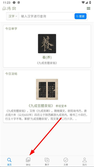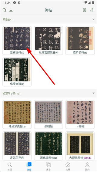 1、打開歐陽(yáng)詢書法字典app,點(diǎn)擊底部導(dǎo)航欄中的碑帖選項(xiàng),進(jìn)入碑帖瀏覽頁(yè)面。