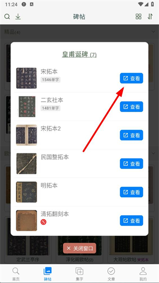 3、點(diǎn)擊后會(huì)彈出碑帖版本選擇窗口,選擇要查看的碑帖版本,點(diǎn)擊其對(duì)應(yīng)的查看按鈕。