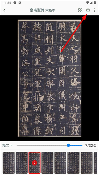 4、進(jìn)入碑帖查看頁(yè)面后,點(diǎn)擊頁(yè)面右上方的收藏圖標(biāo),即可完成對(duì)該碑帖的收藏。