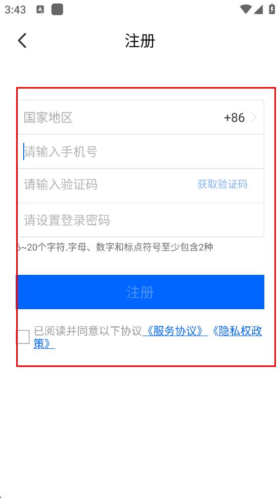 3、在注冊(cè)頁(yè)面,選擇國(guó)家地區(qū),輸入手機(jī)號(hào)碼,獲取并輸入驗(yàn)證碼,設(shè)置登錄密碼,勾選已閱讀并同意相關(guān)協(xié)議,然后點(diǎn)擊“注冊(cè)”按鈕,完成賬號(hào)注冊(cè)。