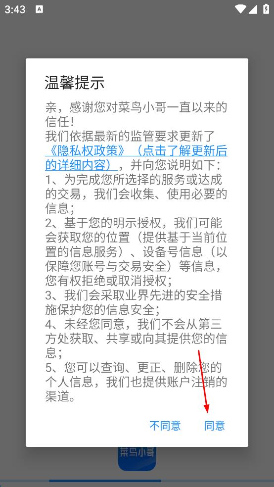 1、打開菜鳥小哥APP,彈出溫馨提示,仔細(xì)閱讀《隱私權(quán)政策》等相關(guān)內(nèi)容后,點(diǎn)擊“同意”按鈕,進(jìn)入登錄界面。