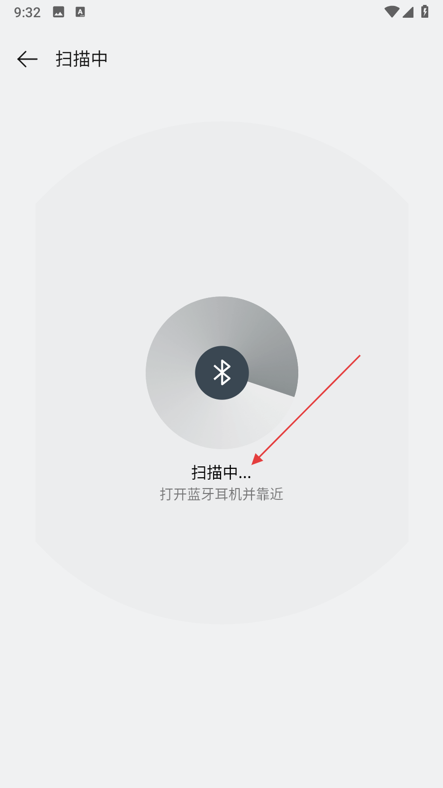 2、進(jìn)入掃描中頁面后,保持藍(lán)牙耳機(jī)處于可配對(duì)狀態(tài)并靠近手機(jī),等待APP掃描設(shè)備。