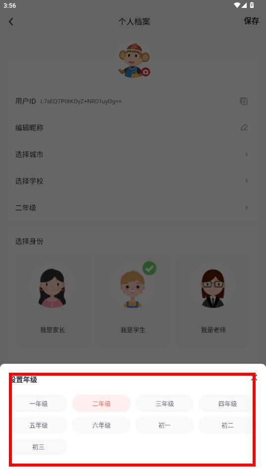 4、在彈出的設(shè)置年級選項中,點擊選擇你需要的年級,完成后系統(tǒng)會自動保存年級信息。