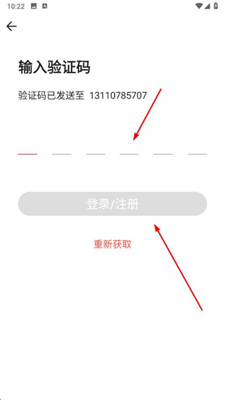 3、收到驗證碼后,在輸入驗證碼頁面填入驗證碼,點擊登錄/注冊,完成注冊操作。