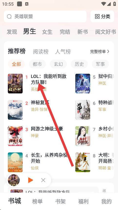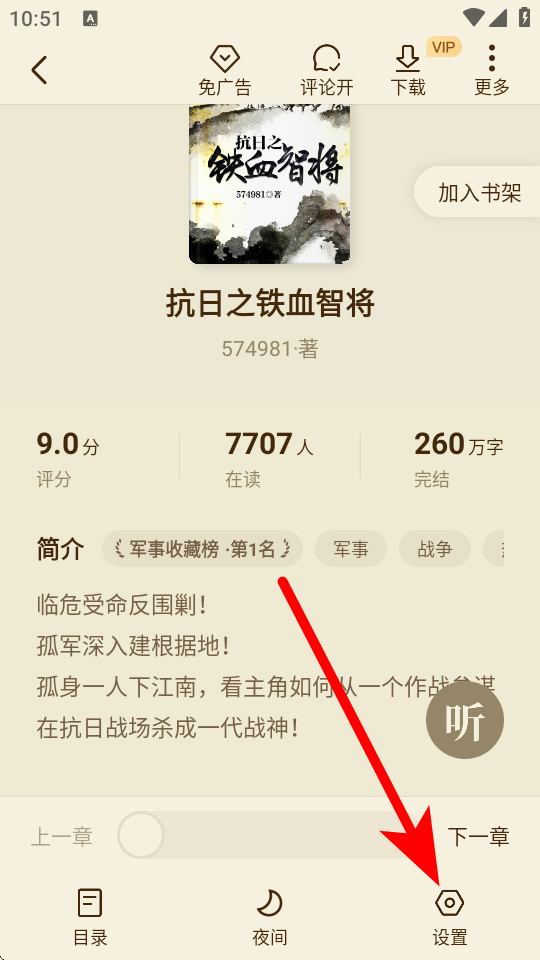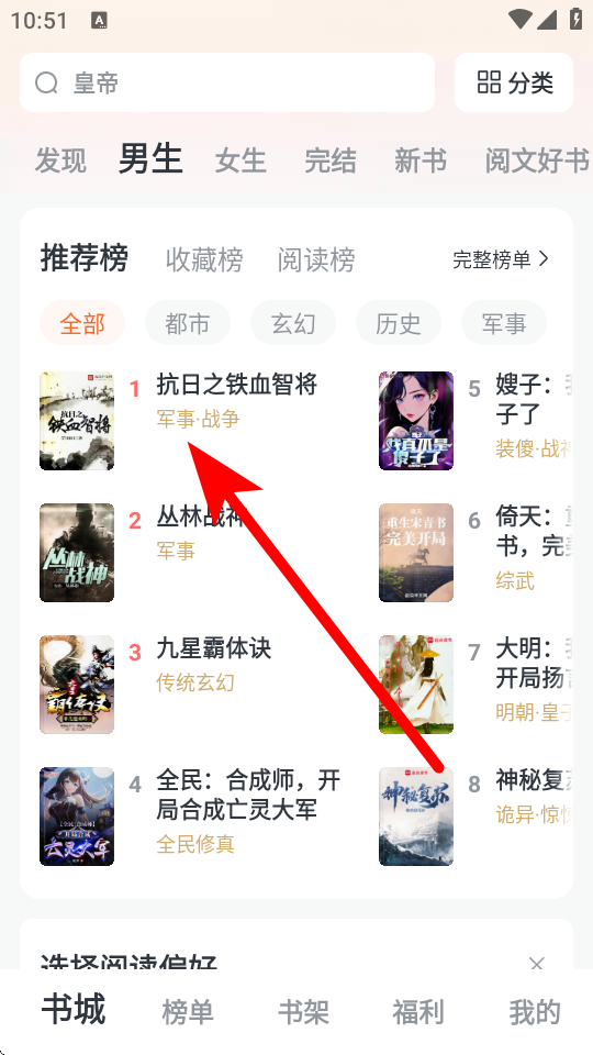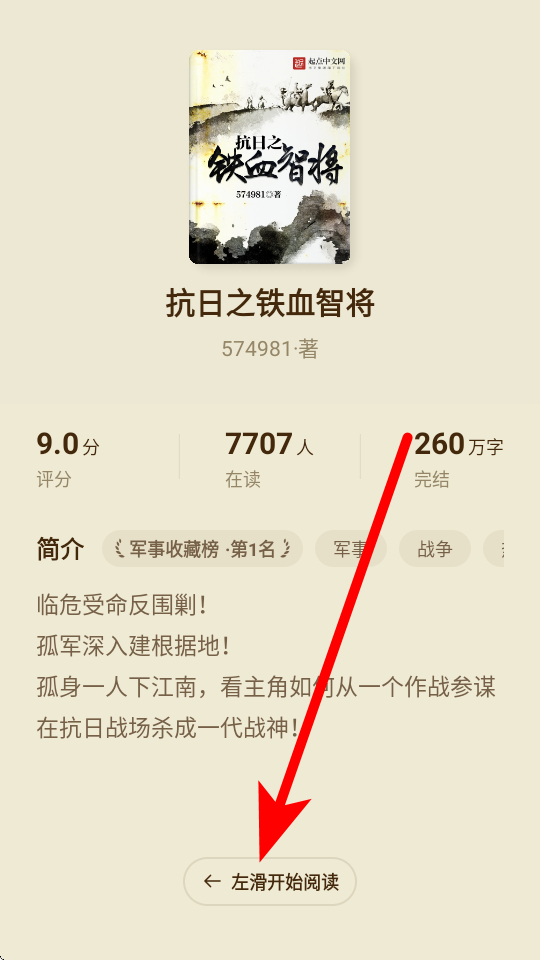 1、在全免小說(shuō)榜單頁(yè)面,點(diǎn)擊想要閱讀的小說(shuō),如抗日之鐵血智將,進(jìn)入小說(shuō)詳情頁(yè)面。