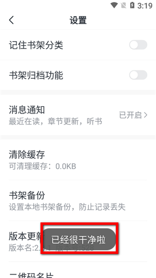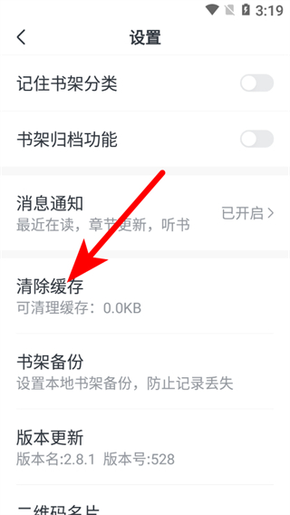 3、在設(shè)置頁(yè)面,點(diǎn)擊清除緩存選項(xiàng),即可清除全免小說(shuō)的緩存。
