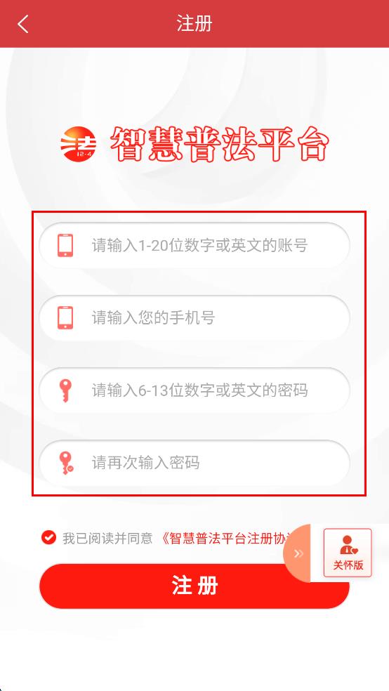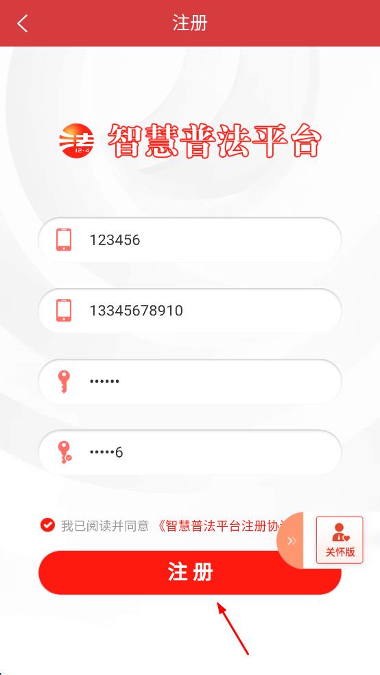 4、信息輸入完成后,勾選我已閱讀并同意智慧普法平臺注冊協(xié)議選項,然后點擊“注冊”按鈕,完成新用戶注冊。