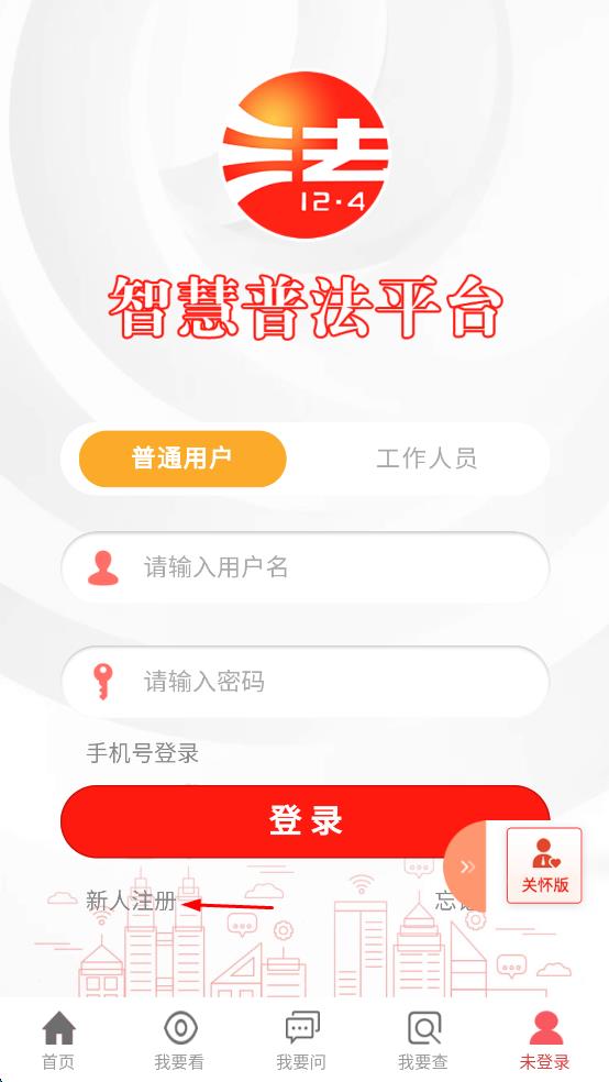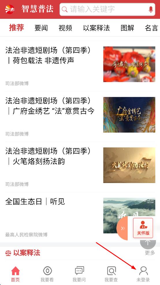 1、打開智慧普法軟件,進入首頁,點擊頁面下方的“未登錄”選項,進入登錄注冊頁面。