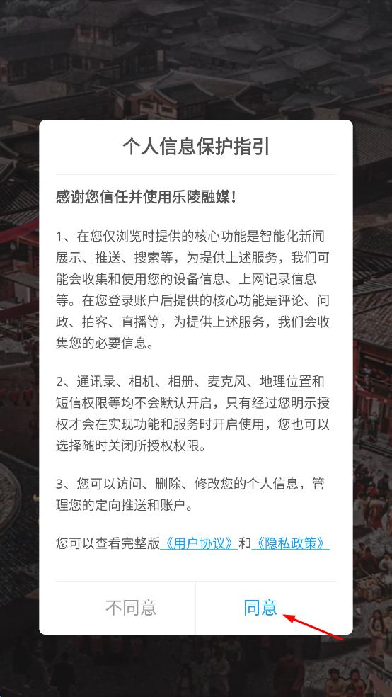 1、打開(kāi)樂(lè)陵融媒APP,出現(xiàn)個(gè)人信息保護(hù)指引界面,仔細(xì)閱讀后點(diǎn)擊“同意”,進(jìn)入主界面。