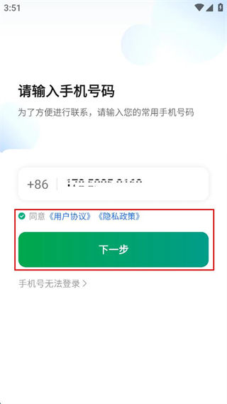 2、在輸入框填寫手機(jī)號(hào),勾選同意用戶協(xié)議和隱私政策,點(diǎn)擊下一步按鈕推進(jìn)登錄流程。