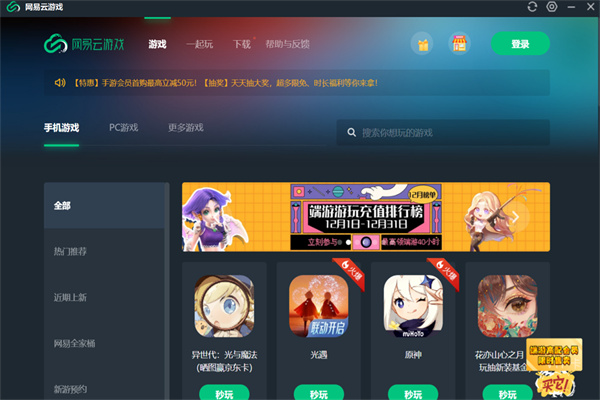 網(wǎng)易云游戲pc端是一個(gè)可以在電腦上運(yùn)行的云游戲平臺(tái)。可以實(shí)現(xiàn)手機(jī)、電腦、tv三端賬號(hào)互通,推送了海量比較熱門的游戲資源,像:原神、光遇、陰陽(yáng)師等等。玩家們無需下載安裝就可以在線免費(fèi)試玩各類網(wǎng)游。想要體驗(yàn)的玩家歡迎體驗(yàn)。