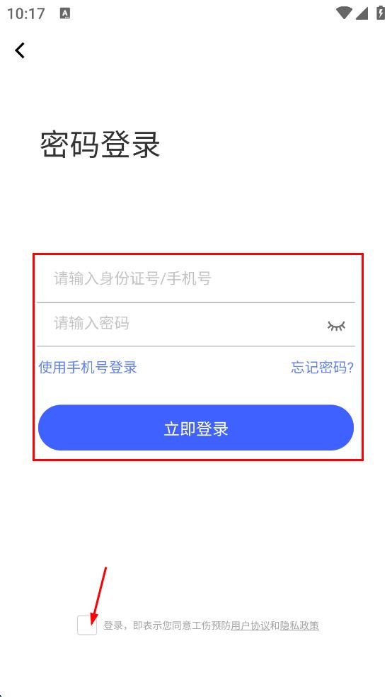 4、在密碼登錄頁(yè)面,勾選登錄即表示同意相關(guān)協(xié)議,輸入身份證號(hào)/手機(jī)號(hào)、密碼,點(diǎn)擊立即登錄即可。