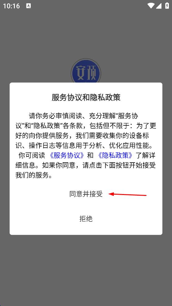 1、打開工傷預(yù)防相關(guān)軟件,在彈出的服務(wù)協(xié)議和隱私政策頁(yè)面,點(diǎn)擊同意并接受,進(jìn)入軟件首頁(yè)。