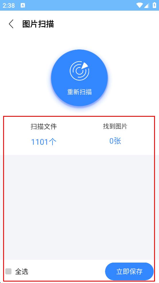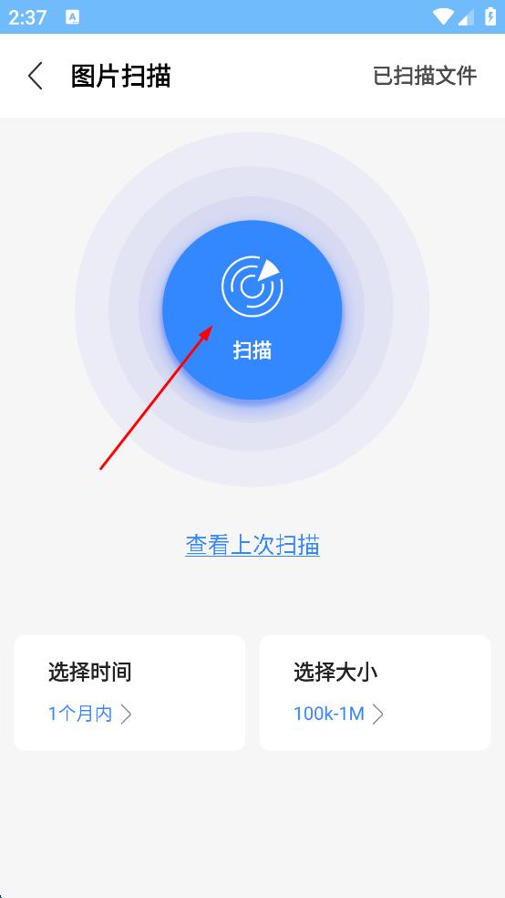3、設(shè)置好后,點(diǎn)擊頁面中間的“掃描”按鈕,軟件開始掃描手機(jī)中的圖片文件。