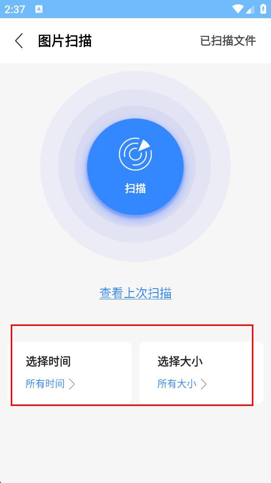 2、在圖片掃描頁面,可根據(jù)需求設(shè)置掃描的時間范圍和文件大小范圍,完成設(shè)置。