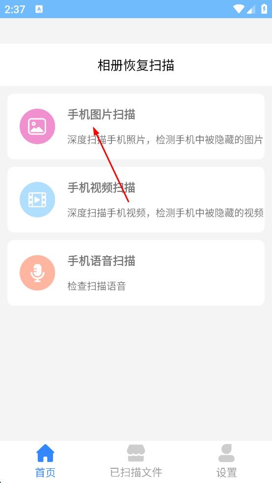 1、打開相冊恢復(fù)掃描軟件,在首頁選擇“手機(jī)圖片掃描”選項,進(jìn)入圖片掃描頁面。