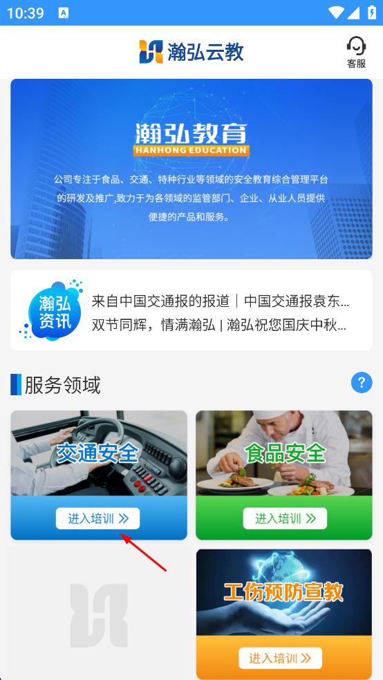 1、打開瀚弘云教APP,在首頁服務(wù)領(lǐng)域板塊,點擊交通安全對應(yīng)的進入培訓(xùn)按鈕。