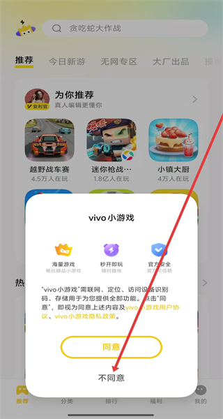 1、點(diǎn)擊“vivo小游戲”協(xié)議彈窗中的“不同意”。