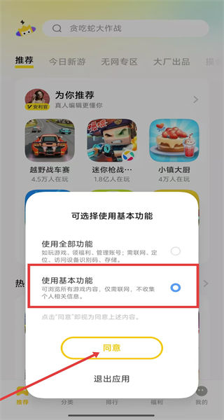 2、在功能選擇彈窗中,選擇“使用基本功能”并點(diǎn)擊“同意”。