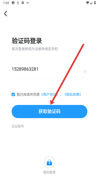 3、在登錄界面輸入手機(jī)號(hào)碼,點(diǎn)擊“獲取驗(yàn)證碼”。