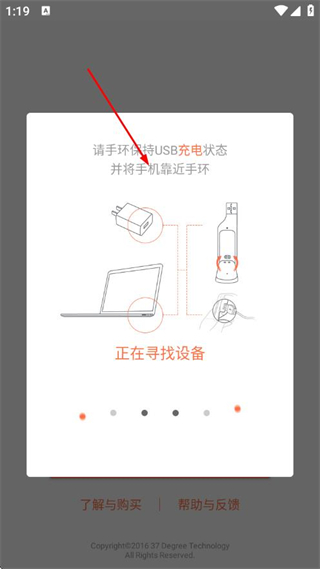 3、將手環(huán)保持USB充電狀態(tài),等待APP尋找并連接設(shè)備,完成手環(huán)綁定。