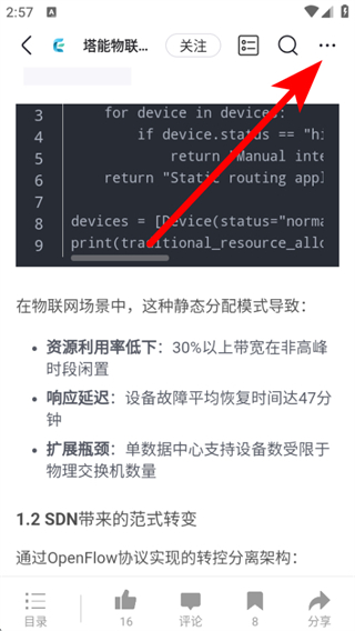 2、在文章詳情頁,點擊右上角的…更多選項按鈕,彈出功能菜單。