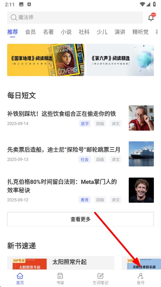 1、打開每日英語閱讀app,點擊底部導航欄最右側的賬號圖標,進入個人相關界面。