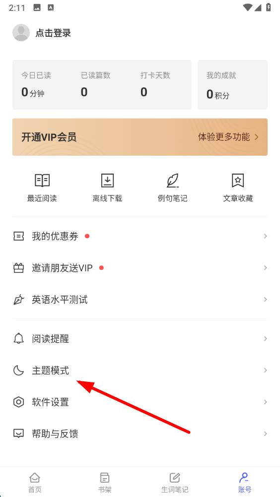 2、在個人界面中,找到并點擊主題模式選項,進入主題模式設置頁面。