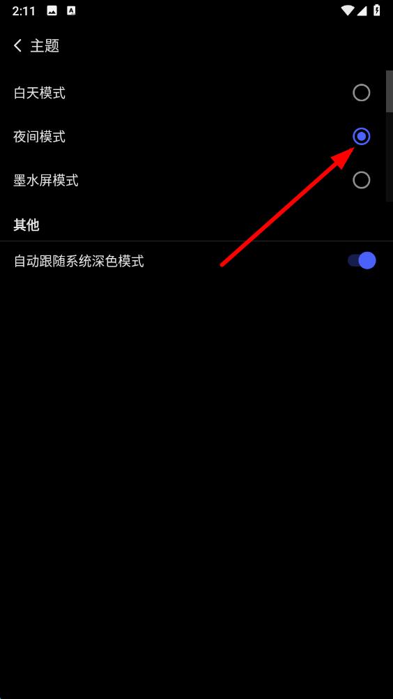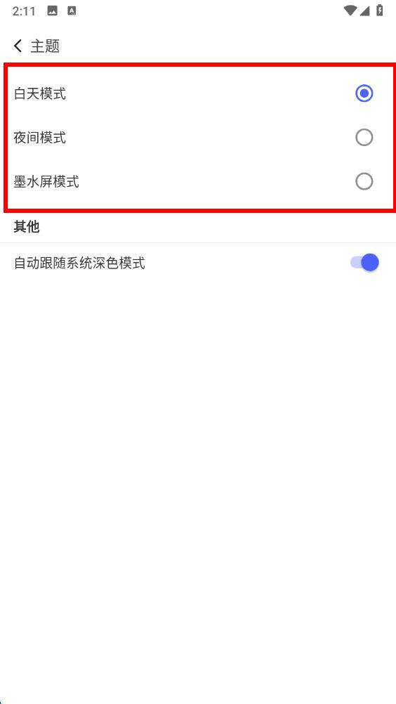 3、在主題模式設置頁面,可以看到白天模式、夜間模式、墨水屏模式的選項欄。