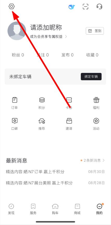 2、在個人中心頁面,點擊左上角設(shè)置圖標(biāo)進(jìn)入設(shè)置界面。