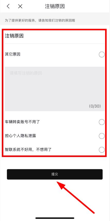 4、在彈出的注銷原因選擇界面中,選擇注銷原因后點擊提交,按照提示完成后續(xù)操作即可完成賬號注銷。