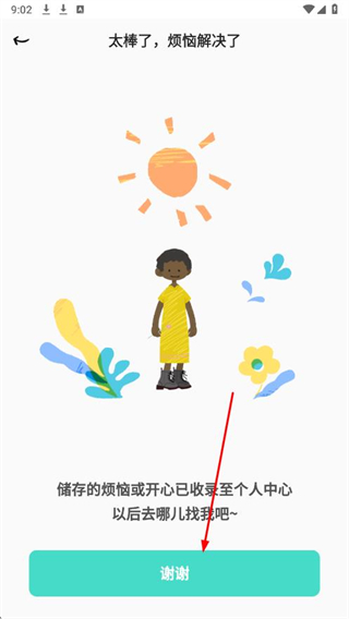4、最后在太棒了,煩惱解決了頁面,點擊謝謝,即可完成煩惱解決流程,相關(guān)記錄會收錄至個人中心。