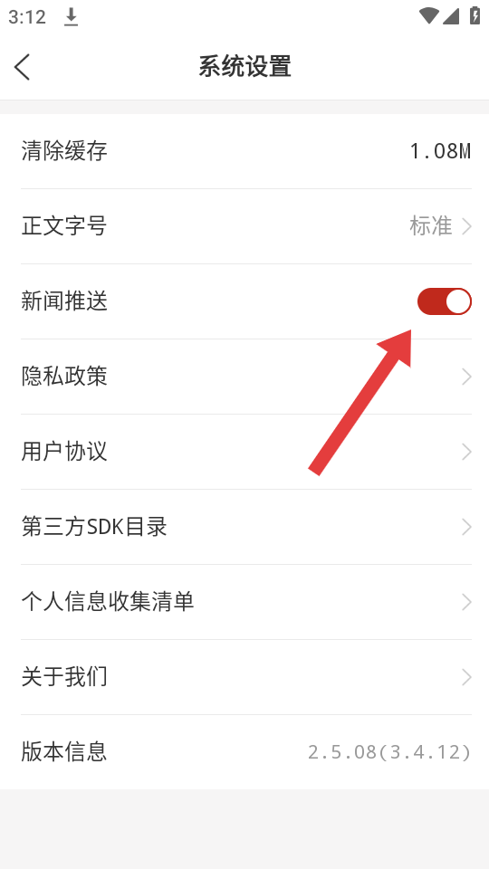 3、在系統(tǒng)設置界面,點擊新聞推送右側(cè)的開關按鈕,將它開啟顯示紅色就代表已經(jīng)開啟推送,即可接收新聞推送。