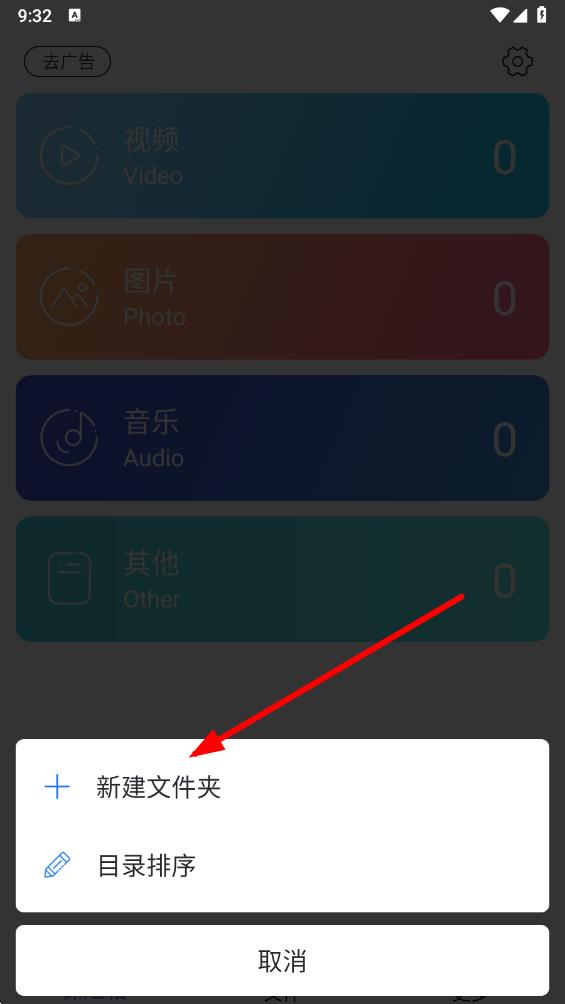 2、在彈出的操作菜單中,點(diǎn)擊新建文件夾選項,進(jìn)入文件夾類型選擇頁面。
