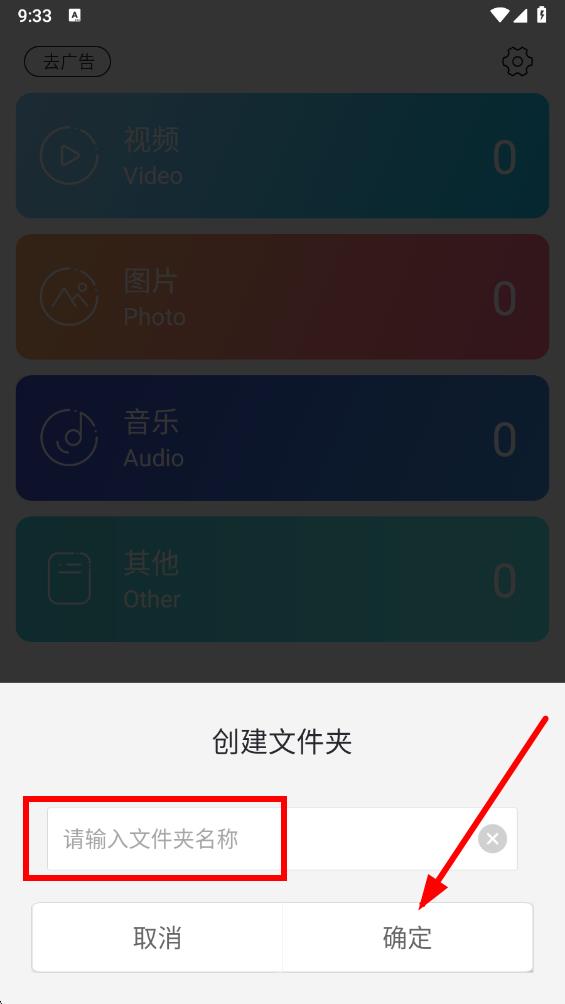 4、進(jìn)入創(chuàng)建文件夾界面后,在輸入框中輸入文件夾名稱,點(diǎn)擊確定,即可完成新建文件夾操作。