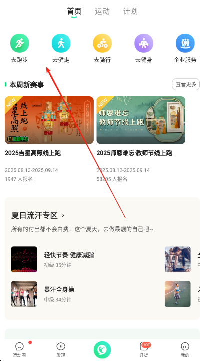 1、打開運動APP進入首頁,點擊去健走等功能入口,參與本周新賽事,如2025吉皇高照線上跑,查看賽事詳情報名時間,點擊報名參與,還能瀏覽夏日流汗專區(qū)課程。