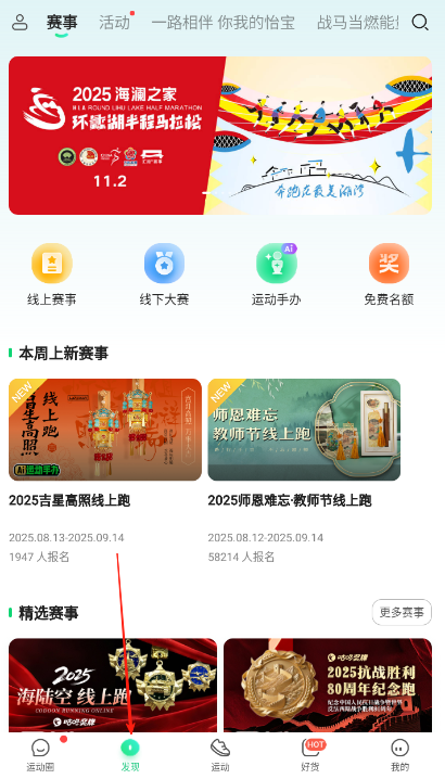 2、切換至底部導(dǎo)航發(fā)現(xiàn)頁面,進入賽事活動板塊,查看線上賽事線下大賽等分類,瀏覽本周上新賽事精選賽事,了解活動規(guī)則報名情況,挑選感興趣賽事參與。