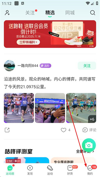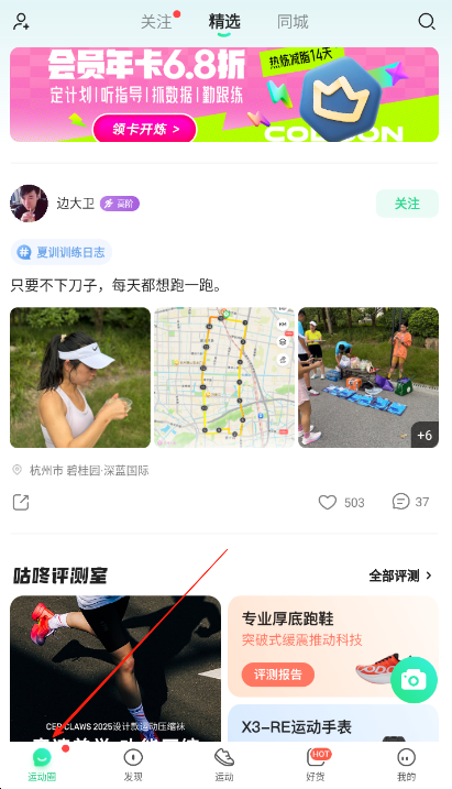 3、進入精選頁面,查看會員年卡優(yōu)惠信息,瀏覽用戶發(fā)布的運動動態(tài),如邊大衛(wèi)的夏訓(xùn)訓(xùn)練日志,點贊評論互動,還能查看咕咚評測室的運動裝備評測,選購好貨。