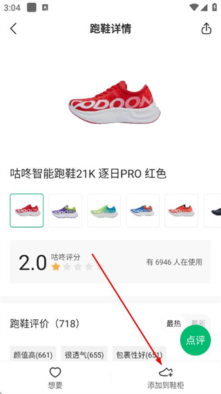 5、在跑鞋詳情頁面點擊添加到鞋柜,即可完成跑鞋添加操作。