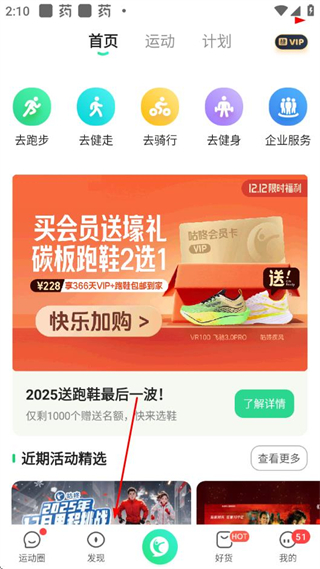 1、打開咕咚APP首頁,點擊底部發(fā)現(xiàn),進入發(fā)現(xiàn)頁面。