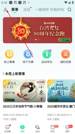 2、在發(fā)現(xiàn)頁面點擊左上角的個人圖標(biāo),進入我的賽事頁面。