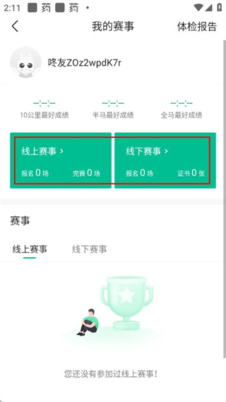 3、通過線上賽事、線下賽事分類,查看已報名、完賽的賽事記錄。
