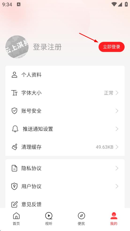 1、打開云上淇縣軟件,進入軟件主界面后,點擊界面下方標注“我的”的圖標,進入個人設置頁面。