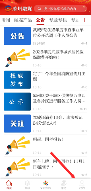 1、在涼州融媒首頁(yè),點(diǎn)擊底部我的按鈕,進(jìn)入個(gè)人的頁(yè)面。