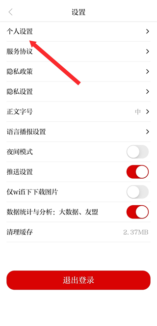 3、在設(shè)置的頁(yè)面,需要點(diǎn)擊個(gè)人設(shè)置,進(jìn)入個(gè)人資料的頁(yè)面。