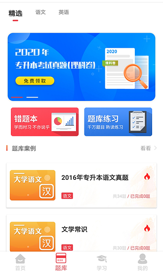 專升本大學語文、高等數(shù)學、英語歷年專升本真題卷、模擬卷、專項知識點訓練、模塊訓練、考前刷題包……應有盡有,滿足各個階段學員的刷題需求。