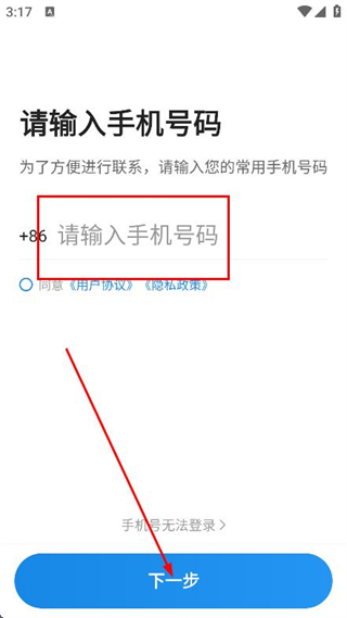 2、進(jìn)入登錄頁面后,輸入手機(jī)號點(diǎn)擊下一步。