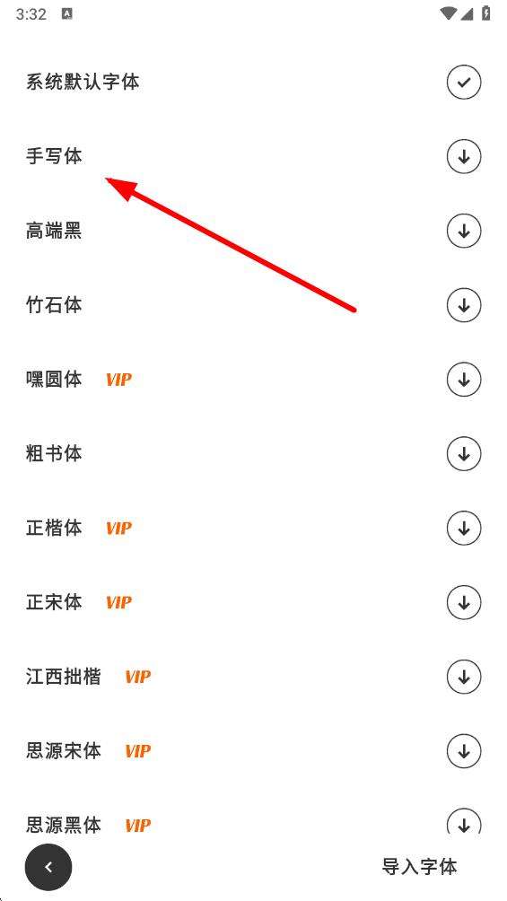 3、在字體選擇頁面里,找到手寫體選項并點擊其對應的下載按鈕。
